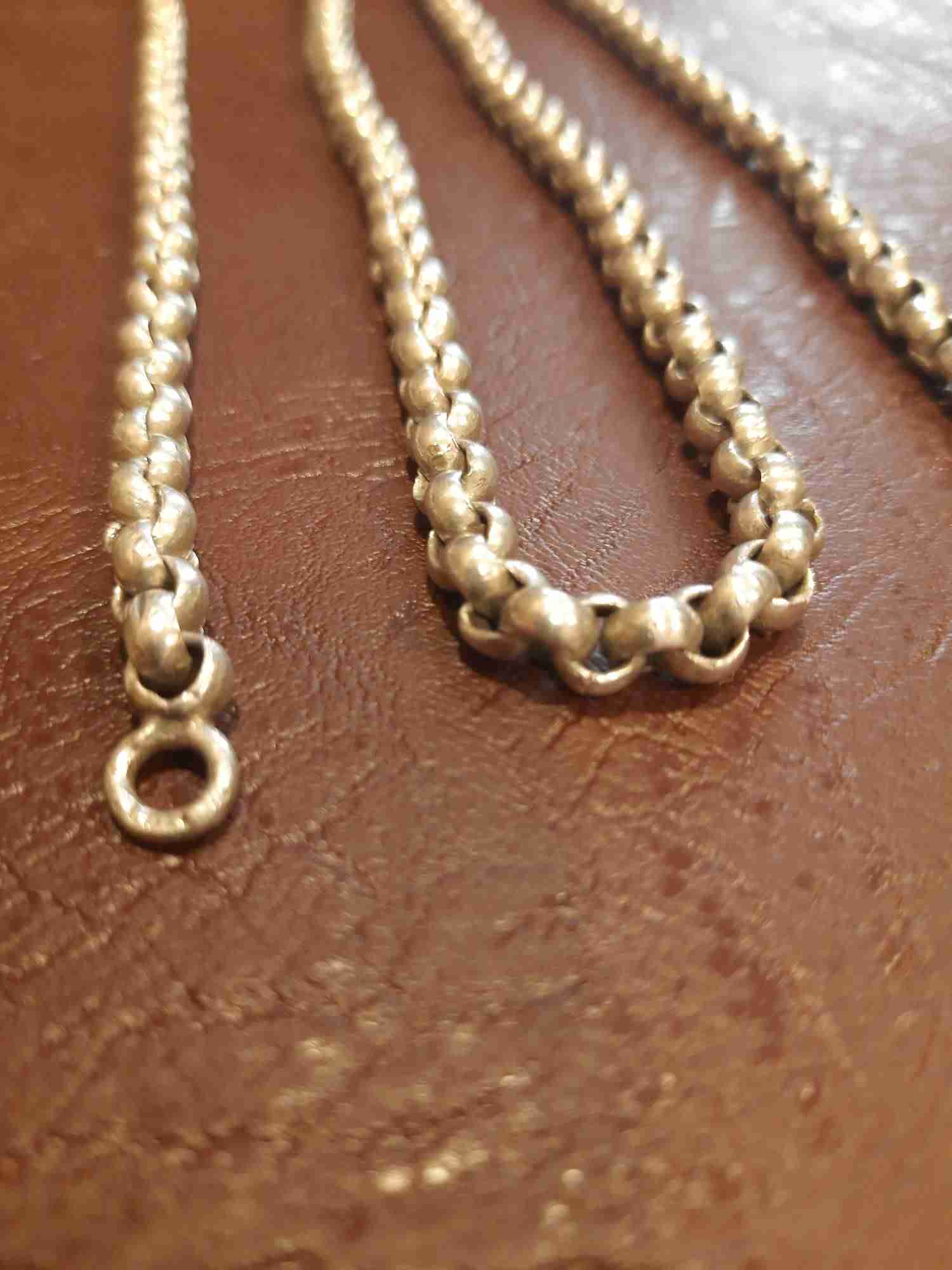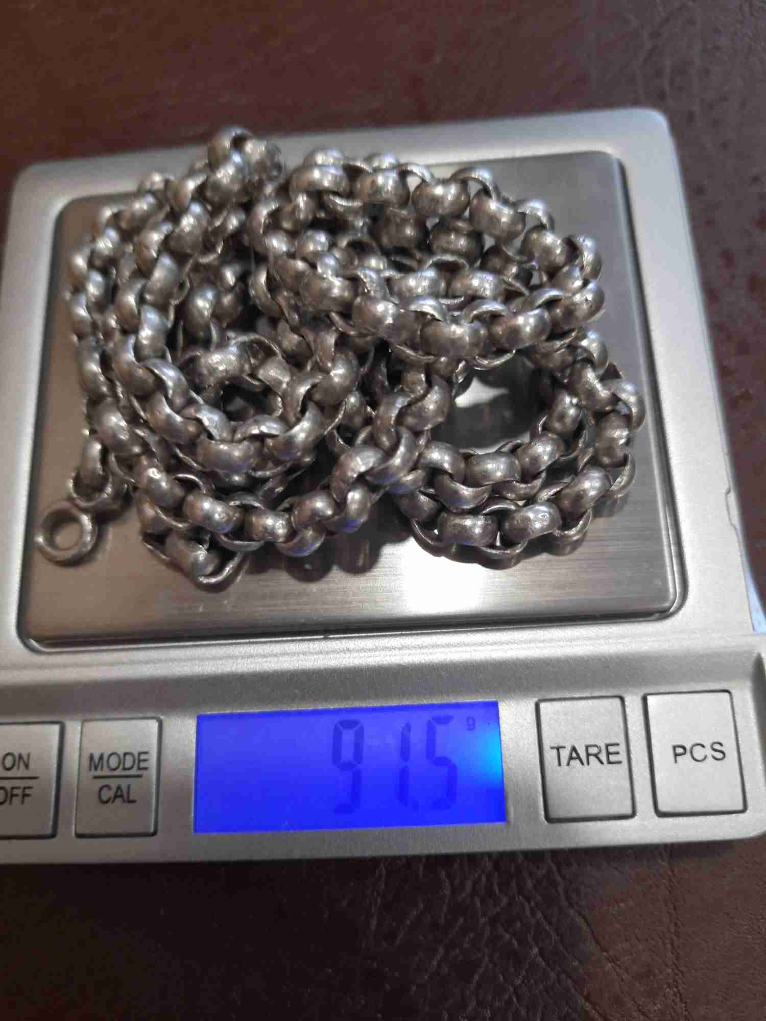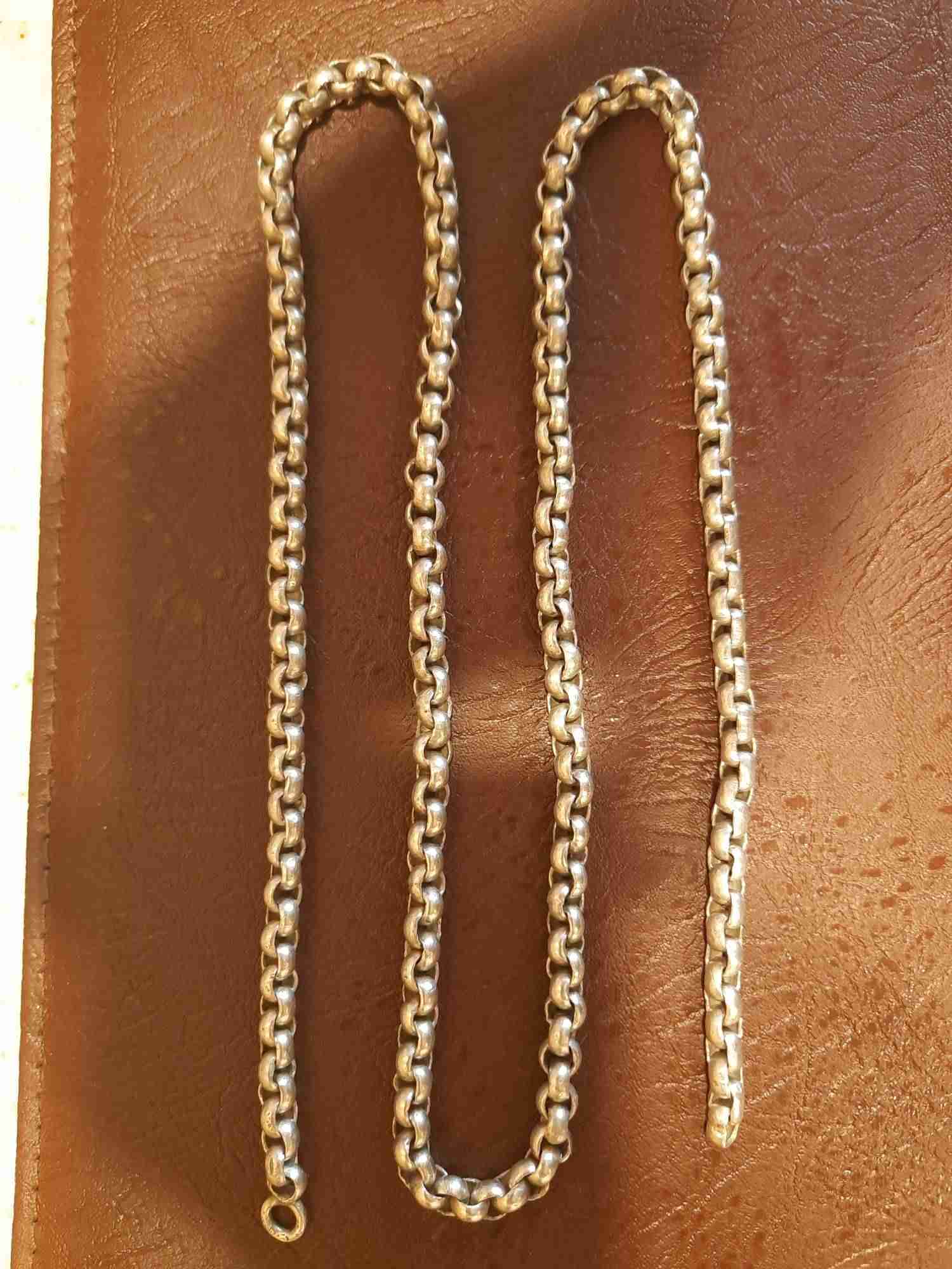 Это "Горох", или "Шопард". Ставился на кадила и лампады. Стандарт длины цепи для кадила 3 по 50 и 1- 40 см, ламппады три по 70 см. Возможно с большой лампады. Может быть нейзильбер с толстым серебрением. Священнослужители носят такое плетение, только диаметр звена 3-4 мм.Современный стандарт длины цепи для наперсного креста 120 см. До революции от 120 до 180. Хотя, попадались мне и цепи старинные под кресты и по 70 см. Слева концевик(колечко) припаяно к звену, может и под крест с закрутками. Как проверили, что серебро?