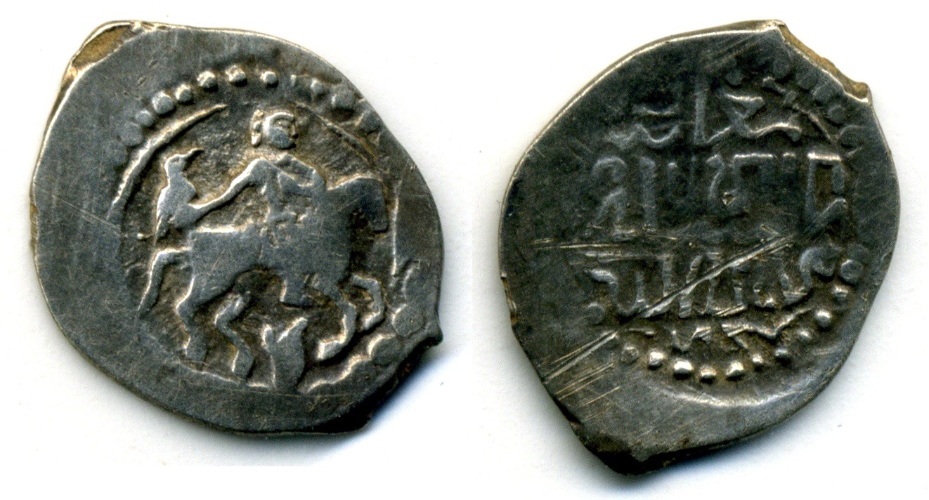 Поздняя анонимная денга Василия Дмитриевича Московского с сокольником и подражанием арабографичной надписи, конец 1410-х гг. Четкая монета с рельефным сокольником (хорошо видны черты лица), небольшой царапиной на оборотной стороне, вживую практически не заметной.