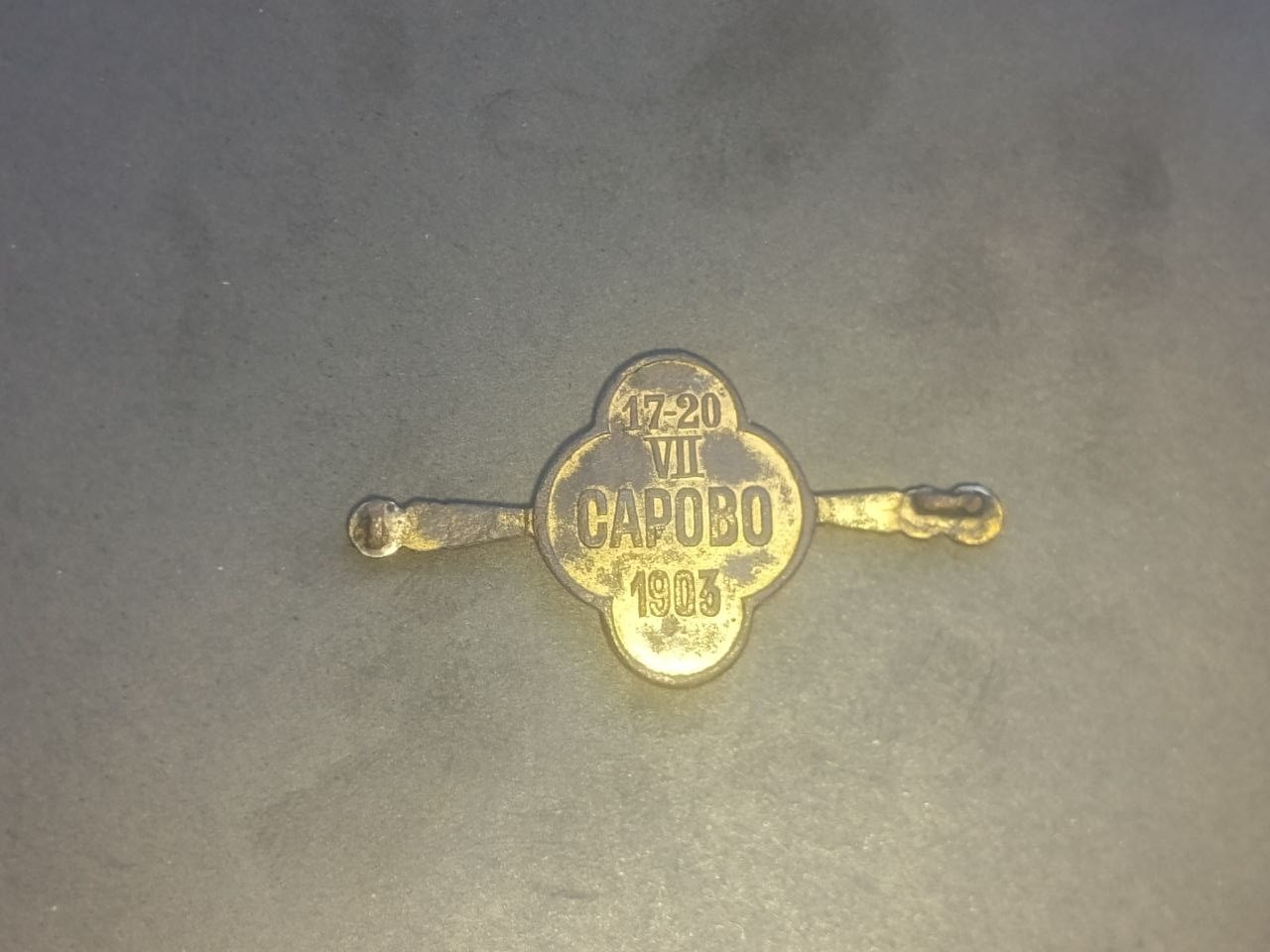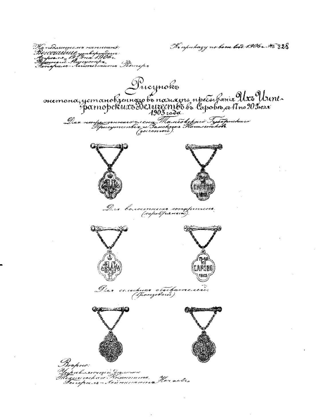 Вручался членам добровольной народной охранной дружины принимавшим участие в праздничных мероприятиях 1903 года. На лицевой стороне в центре - вензель из трех букв, означающих имена императорской династии, которые принимали участие в торжествах. На оборотной стороне дата проведения торжественных мероприятий "17-20 VII Сарово 1903" «Позже члены добровольной народной охранной дружины принимавшим участие в праздничных мероприятиях 1903 года, были вручены жетоны. Таких жетонов в коллекции музея 3. жетоны бронзовые подвесные, с цепочкой и фигурной булавкой, выполнены в форме четырехконечного креста с закругленными концами. Они предназначались лицам крестьянского управления и сельским обывателям. На лицевой стороне в центре - вензель из трех букв, означающих имена императорской династии: А Н М. вензель увенчан царской короной. На оборотной стороне надпись "17-20 VII Сарово 1903". Эскиз жетонов разработан придворным ювелиром Карлом Фаберже» Август 1903 года. По заявленной фирмой Фаберже цене на памятные жетоны подсчитали поначалу участвовавших в торжествах нижегородцев: 34,440 крестьян (им бронзовых жетонов по 95 коп. штука), на 32,948 руб. На 4 разночинца (серебряных по 1 р.40 коп.шт.), — 5руб.60 к. Тамбов заказал на: 39 Земских начальников и 1 Непременного Члена — (золотых по 15 руб. штука), т.е. 600 руб. На 195 волостных старшин (серебряных по 1р.40к. штука) — 273 руб. Охране: 410 мужчин (белой меди и бронзовых по 95 к.шт) — 389р.50к. На 230 женщин (такая же брошка по 85 коп.шт.) — 195 р.50к. Всего за все значки: 34,411 руб. 40коп.» Доклад Министра Внутренних Дел В.К.Плеве Николаю II: «Вашему И.В-ву благоугодно было всемилостивейше разрешить пожалование лицам, принимавшим участие в поддержании порядка в пределах Нижегородской и Тамбовской губерний во время Высочайшего проезда и пребывания В.В-ва и И.И.В-в государыни императрицы Марии Федоровны и государыни Александры Федоровны на торжествах прославления преп. Серафима Саровского жетонов для ношения на груди, изготовленных по образцу золотого, утвержденного В.В-вом, в 27 день минувшего июля, по всеподданейшему докладу Министра Императорского двора, для Земских начальников Нижегородской губернии и некоторых других должностных лиц. Представляя на Всемилостивейшее благовоззрение В.В-ва рисунок жетона, приемлю смелость испрашивать Высочайшее разрешение на пожалование его лицам крестьянского управления и сельским обывателям Тамбовской и Нижегородской губерний, принимавших участие в охранении порядка, причем лицам женского пола — в виде брошки. Вместе с сим испрашиваю Всемилостивейшее соизволение В.В-ва на награждение золотыми жетонами по образцу пожалованных Земским начальникам Нижегородской губернии, также Непременного Члена Тамбовского губернского присутствия и Земских начальников Тамбовской губернии, содействовавших охранению порядка во время Высочайшего пребывания в Сарове». Справка по 1 Отделению Департамента Общих Дел МВД уточнила число участников добровольной охраны: «По телеграфным сведениям, доставленным в августе с.г. Нижегородским и Тамбовским губернаторами: участвовали по Нижегородской губернии — 145 волостных старшин, 804 сельских старост, 29776 сельских обывателей, 6715 крестьянок. По Тамбовской губернии — 1 Непременный Член, 39 Земских начальников, 195 волостных старшин, 410 крестьян и 220 крестьянок |