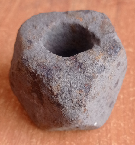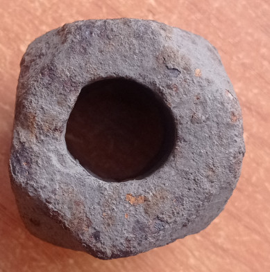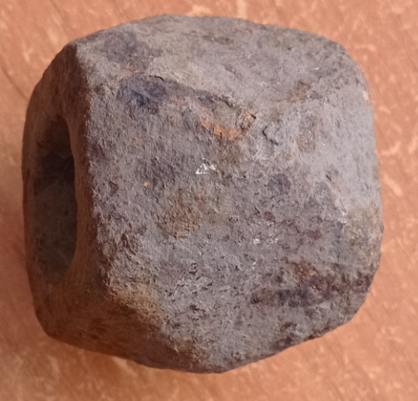 Одиночная лесная находка.Форма асимметрична.Размер куба 42х45 +-. Диаметр отверстия неодинаковый - 19- 20 мм. с одной и 25-26 с другой стороны.Приблизительно 490 грамм.