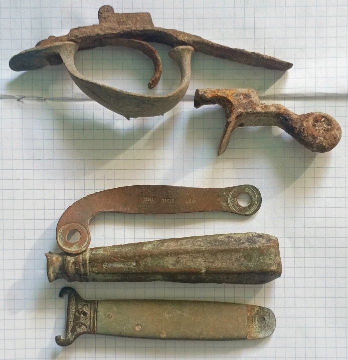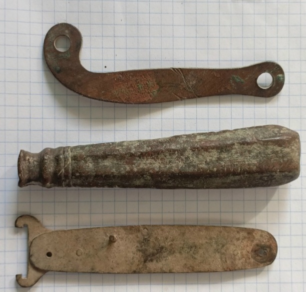 Нижний предмет - останки складного ножика с экстрактором для извлечения гильзы из "переломок " , с казнозарядных ружей . В одном лоте , с остальными предметами он как то не очень в теме .