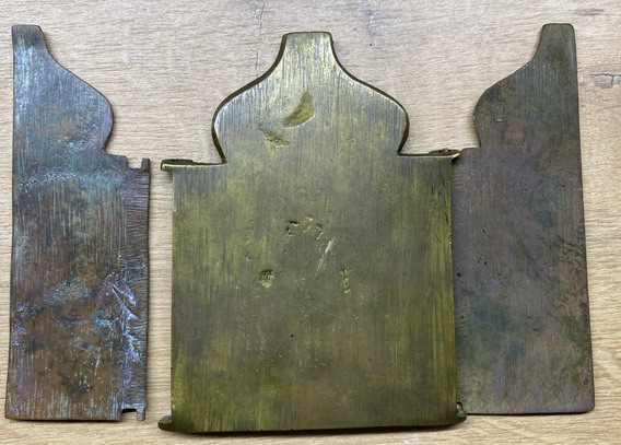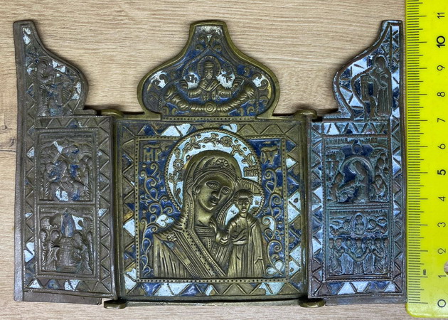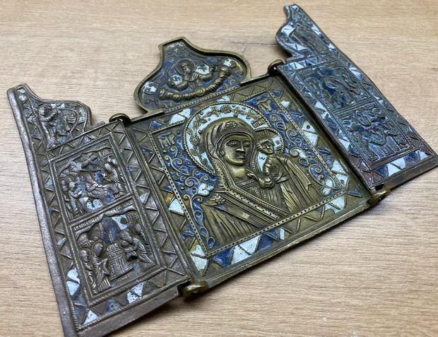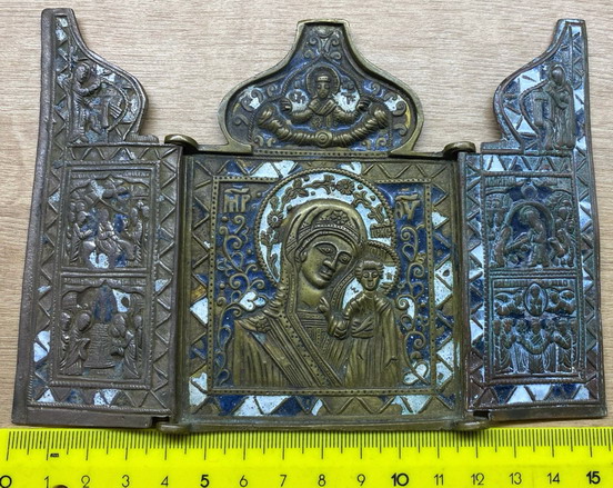 Предложу лот - Складень трехстворчатый "Богоматерь Казанская", бронза, литье, Российская Империя, 1850-1890 гг. Бронза, эмали. Створки в подборе,левая полностью не закрывается. показал всё на фото.Состояние и размер на фото. Любые фото по просьбе вышлю в личку.