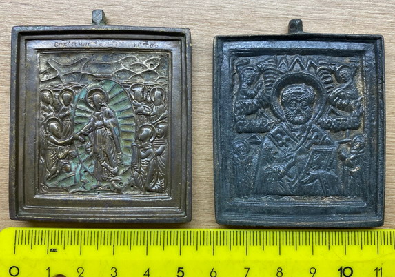 Предложу лот - Иконы Святитель Николай и Воскресение Христово(очень толстая и тяжелая) 19в эмали. Бронза. Состояние и размер на фото. Любые фото по просьбе вышлю в личку.