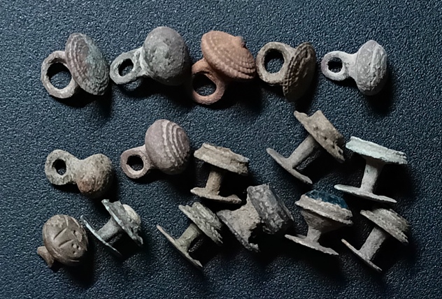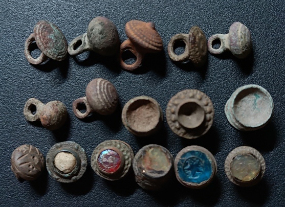 Лот маленьких не чищенных пуговиц, 16 шт. (гирьки, со вставками и др.).