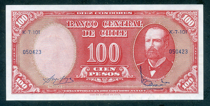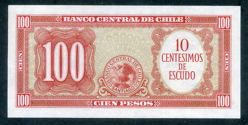 10 сентесимо Чили, временный выпуск 1960 года с надпечаткой номинала в новой валюте на оборотной стороне банкноты прежнего образца в 100 песо, 3-й тип подписи.