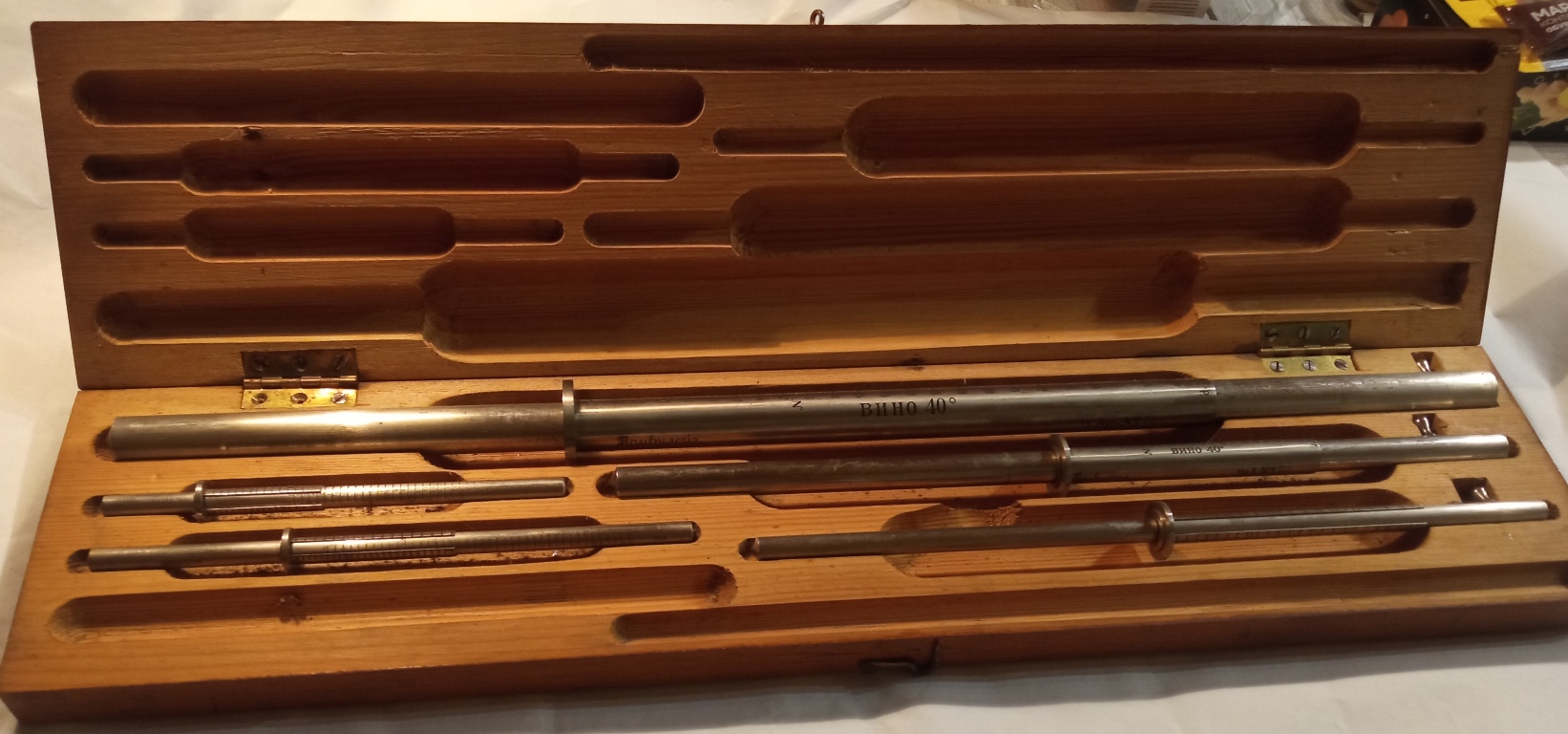 Шкала градусы по Реамюру . Самая большая палка 1/4 ведра и дальше палки на уменьшение 1/20, 1/40, 1/100, 1/200. Никелирована бронза. |