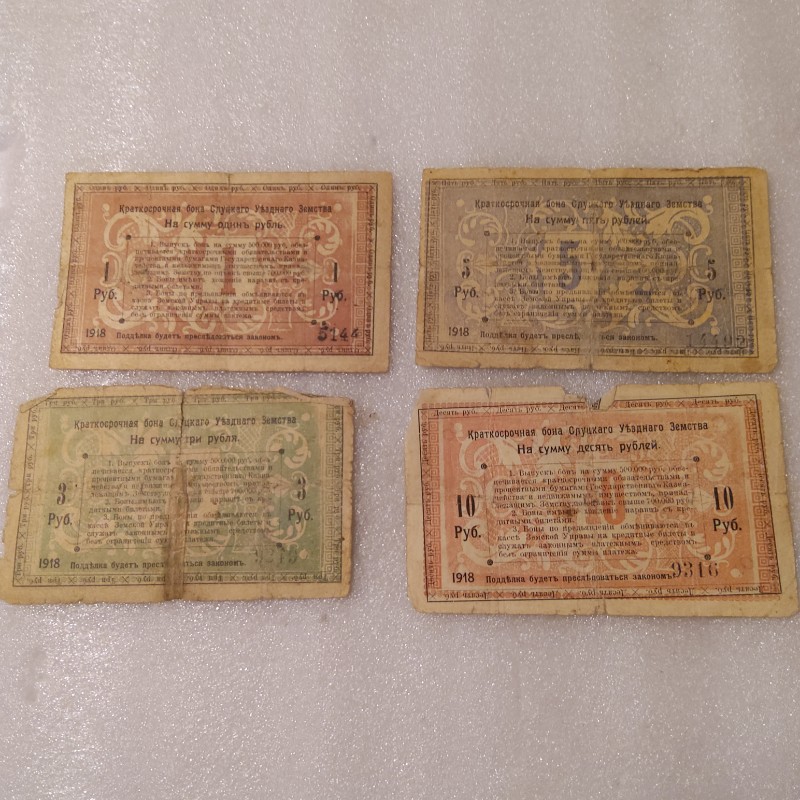 лот не частых бон случконо земского уезда 1918 год: 1 рубль+3рубля+5 рублей+10рублей