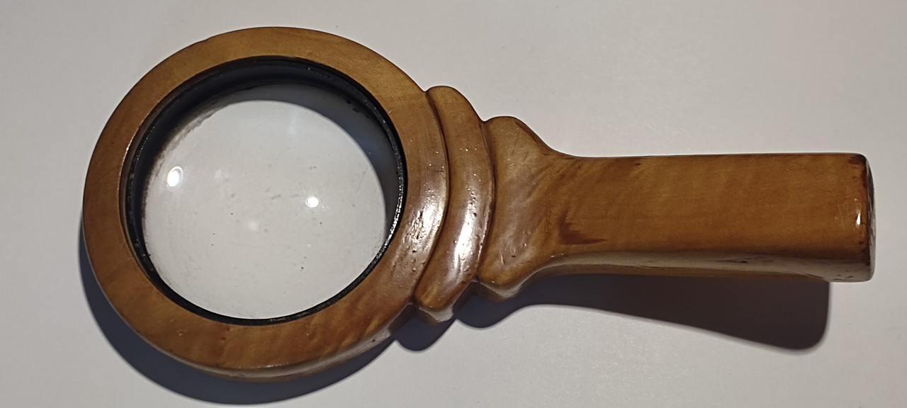 Подвернулось сухое полено из старой груши. Вспомнилась линза от старого увеличителя. Поработал руками, соединил, полачил, Пользуюсь третий десяток лет.
