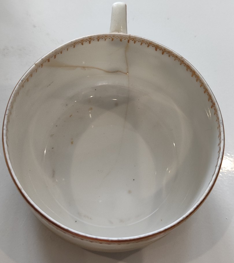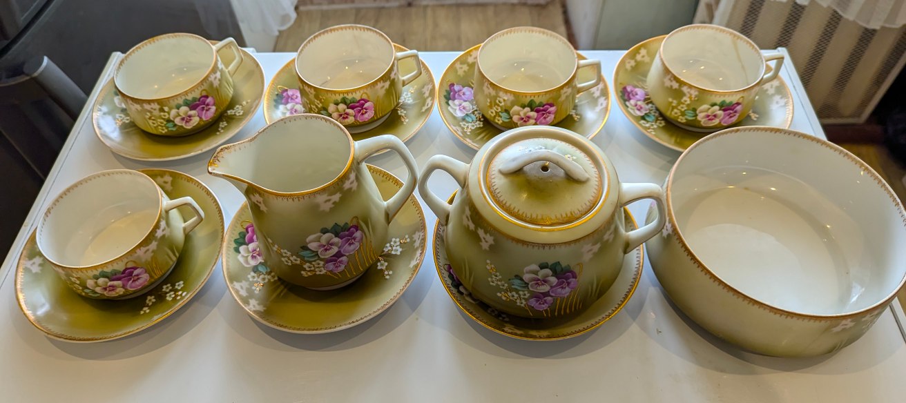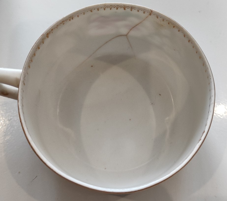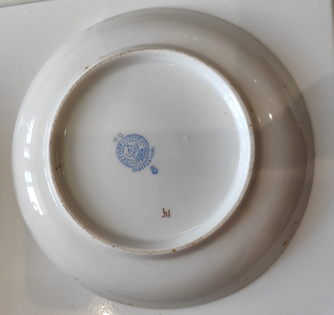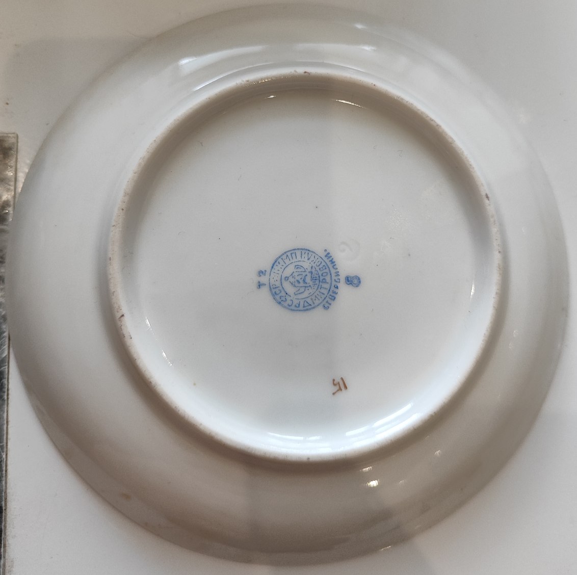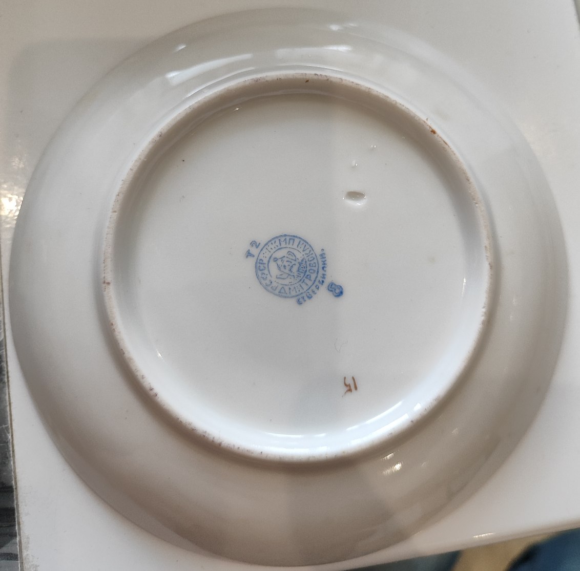 1934-40 год. Одной чайной пары не хватает. По остальным предметам сделайте описание- на скольких предметах есть дефекты ( сколы, трещины) и сколько предметов без дефектов. |