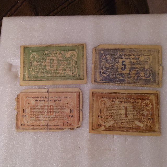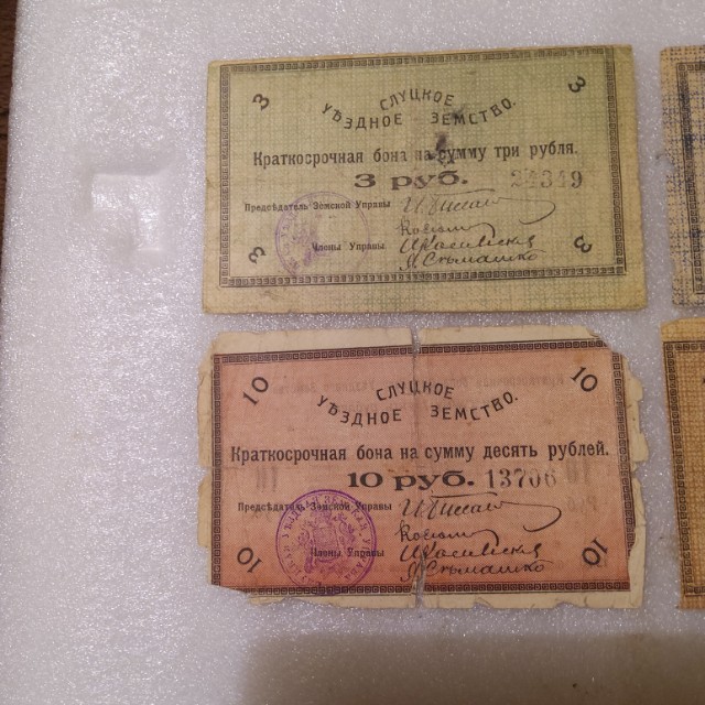лот редких бон Слуцкого выездного земства 1918 год,номиналы 1 рубль 3 рубля 5 и 10 рублей