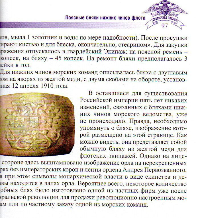 И что там показано - образец бляхи с таким же штампом! Никто при обсуждении "без коронного моряка" не показал другого штампа. (или я не заметил?) Еще есть статья Лазарева "ФОРМА ОДЕЖДЫ И ВОИНСКИЕ ЗНАКИ РАЗЛИЧИЯ НА ФЛОТЕ В ФЕВРАЛЕ—ОКТЯБРЕ 1917 ГОДА" ссылок на документы я не нашел. Ясно одно, штамповала такие пряги одна артель, тираж малый, официально не утверждена, самодеятельность частного предпринимателя, обязательность ношения военнослужащими не имеет места быть. Вложенные эскизы изображений |