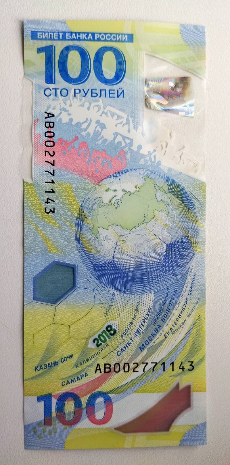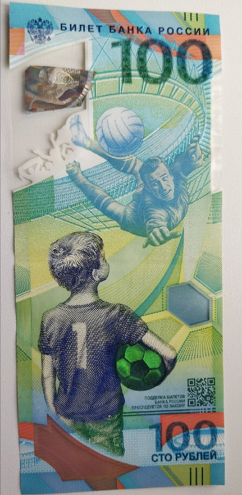 Памятная банкнота номиналом 100 рублей посвящена Чемпионату мира по футболу 2018, полимерная банкнота, выпущенная Банком России.