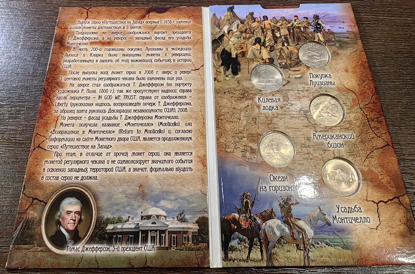 Предложу набор монет США - Путешествие на Запад. Коллекционный альбом «Путешествие на Запад» Подарочный набор юбилейных монет США номиналом 5 центов в тематическом альбом серии «Путешествие на Запад» - обязательный атрибут коллекционера и поклонника американской нумизматики. Серия «Путешествие на Запад» включает 5 монет: 5 центов Покупка Луизианы 5 центов Килевая лодка 5 центов Американский бизон 5 центов Океан на горизонте 5 центов Усадьба Монтичелло Отдам для изучения, предложившему наивысшую стоимость залога. Время изучения не ограничено. Старт: 100 руб. Шаг: 50 рублей и более блица нет. Окончание в 22.00 по Москве 14.02.2026. Антиснайпер 10 мин. многократно. Пересыл только по РФ на покупателе +150 руб. Ответственность за работу почты не несу, качественную упаковку гарантирую! Предоплата 100% на карту СБ в течении трех суток после завершения аукциона. Ставки от участников с нулевой репутацией не принимаются. Спасибо и удачных торгов! Вложенные эскизы изображений -------------------- Если я выиграл Ваш лот, напомните мне пожалуйста в личку! Спасибо!