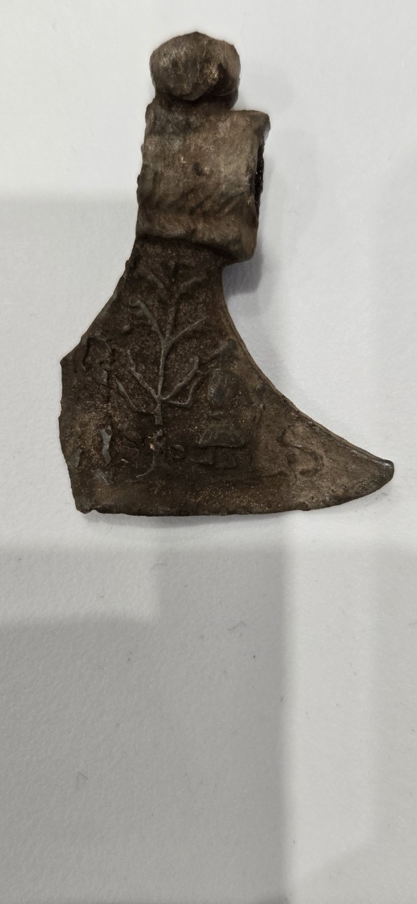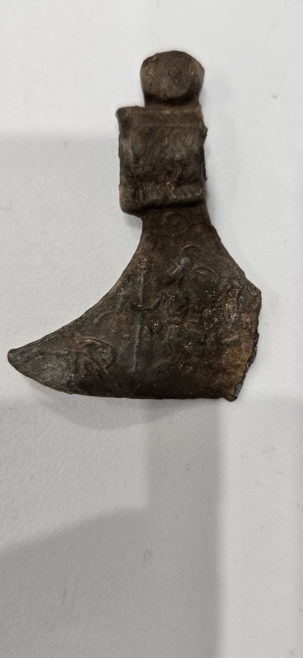 Приветствую, интересный топорик. На первый взгляд языческий оберег, а сюжет как на 15в: воин(или два) у древа жизни. Интересно было бы услышать мнение спецов. С ув.