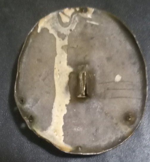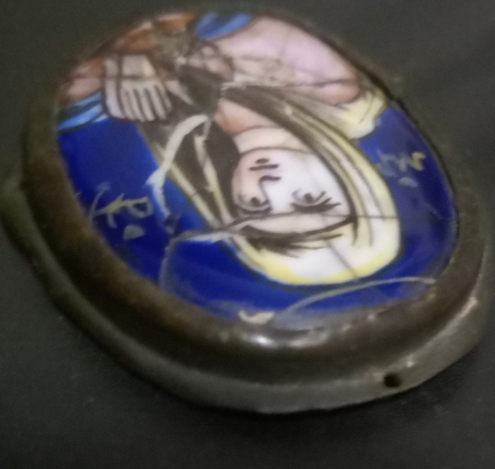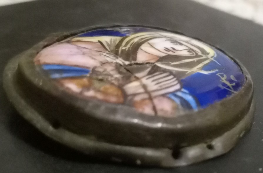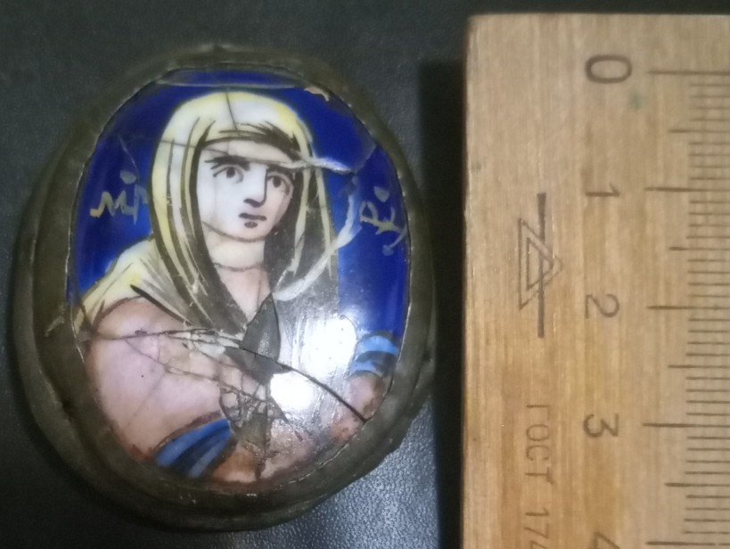 Вот такая иконочка с Богородицей, небольшая, в высоту 4 см. Керамика с эмалью, финифть кажется правильно называется. С боков и сзади обрамлена латунным окладиком, видны следы креплений как сзади по центру, так и по бокам отверстия. Думаю деталь чего то, или большой иконы или большого креста( как предположение).