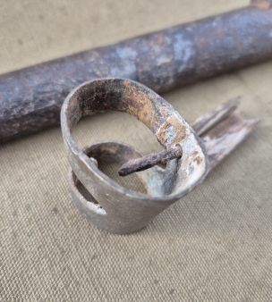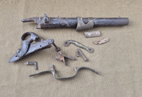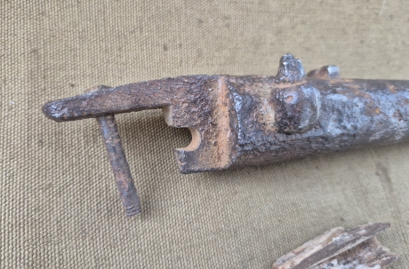 А не обрез ли это, с чернолиховки? Казенная часть ствола, курок и спуск шарик, как с винтовки. Скоба и капуцин от другого оружия.