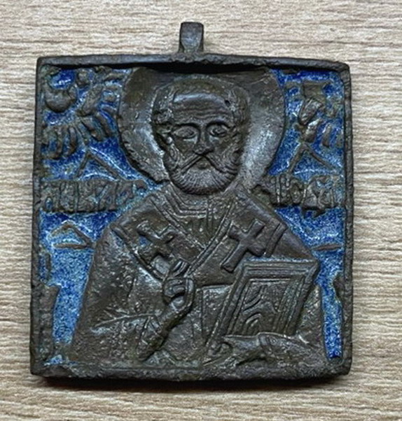 Предложу лот - Один из самых редких типов Выговской иконы Святителя Николая 18век, 30х30мм крапчатая эмаль, Отличный рельеф для данного типа.