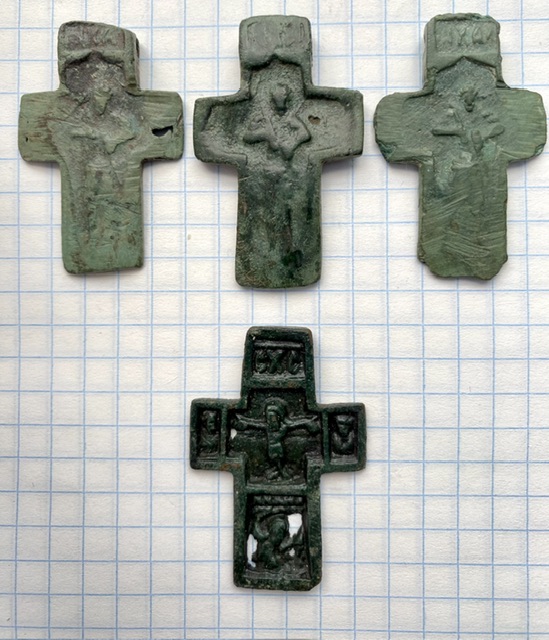 Три крупных креста, тверского типа, 15-16 в.в. Красивая зелёная «вековая» патина. Бонусом, ещё один крестик этого же типа, «пострадавший» в войне Москвы и Твери (сточеная обратка). Старт: 500 шаг - 50 + Блица нет. Антиснайпер 10 мин., многократно. Оплата: карта СБ. Доставка: почта России, по чеку. Вложенные эскизы изображений -------------------- систем+