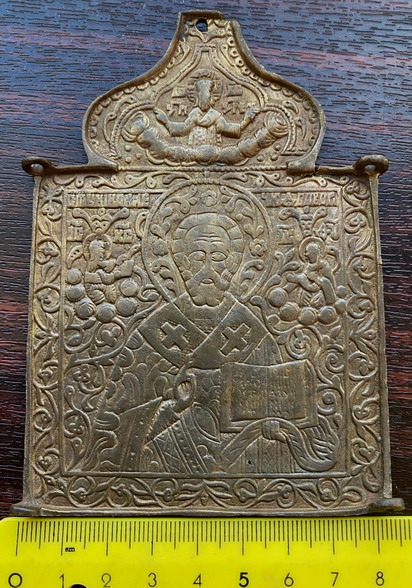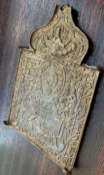 Предложу лот - Средник купольного складня Святитель Николай, 19в, бронза. Петли целые.