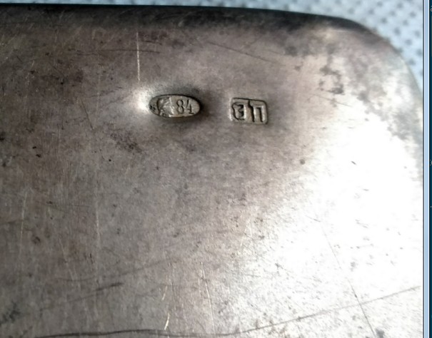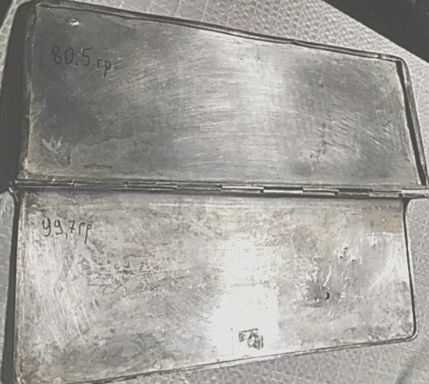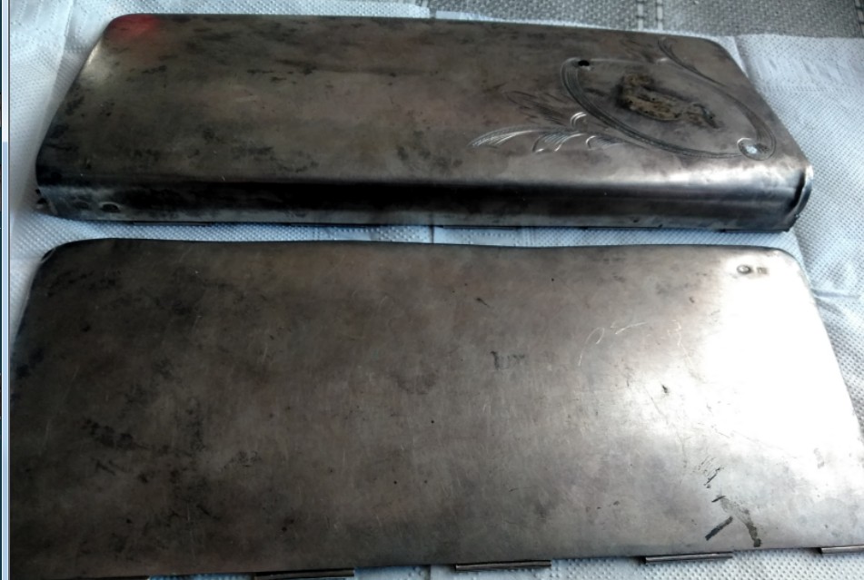Две пластины из серебра 84 пробы разобранный очень большой клатч с оттисками пробы и именника мастера, размером 220 х 90 х 1 мм, петли целые, идеальный материал для ремонта старинных изделий этой пробы.