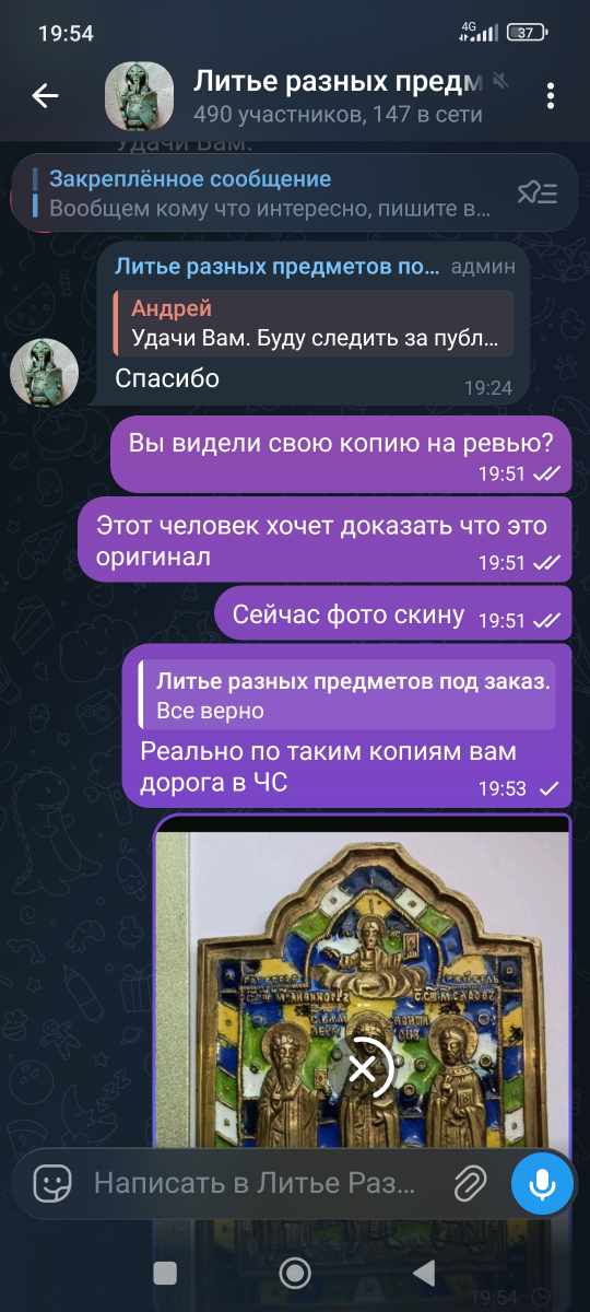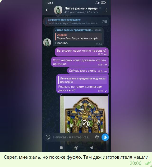 QUOTE(Калинин @ Feb 19 2026, 20:13) Клоун Вы форумный, Роман, а не подстаринщик. Подстаринщиком быть — много тщания надобно а в Ваших иконных экзерсисах тщания по сю пору замечено не было; так, рукоделие на коленке... Коллега, просто примите как данность, что предмет новый. Вас никто не обвиняет, не называет фуфлоделом; Вы, к сожалению, попали на выкуп предмета, который Вам преподнесли в качестве настоящего. Признаков стараются не раскрывать (ну, разве что, в пылу обсуждения) — потому что раскрывать признаки означает учить новодельщика работать всё лучше и лучше. Верните предмет, если есть возможность. Если нет — ну, что ж.. Вы приобрели опыт за свои деньги. Это нормально; все знатоки через это проходили. Вот за это спасибо! Все по делу и четко. Единственная поправка, я никуда не попал, Слава Богу, это домыслы тут не совсем адекватного человека. Попал знакомец, а вернее его родственник, который сие ему подарил. Иконы вообще не мое в жизни бы не стал связываться. Еще раз спасибо! -------------------- Если Вы откажетесь от своей мечты, то что останется?