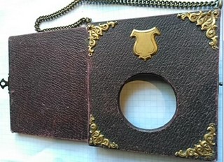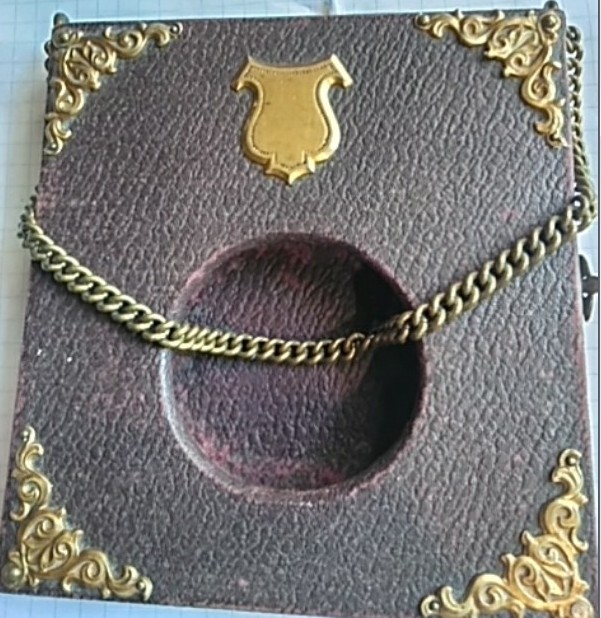 Старинный футляр для карманных часов, который можно повесить с часами за цепочку футляра на стенку.