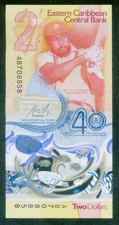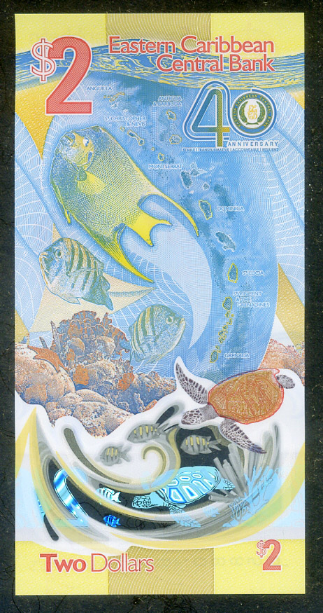 Памятные 2 доллара Восточно-Карибских штатов 2023 года - 40 лет Восточно-Карибскому Центральному банку, полимер, состояние пресс.