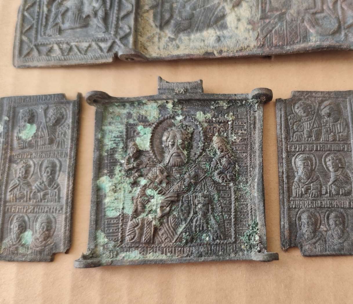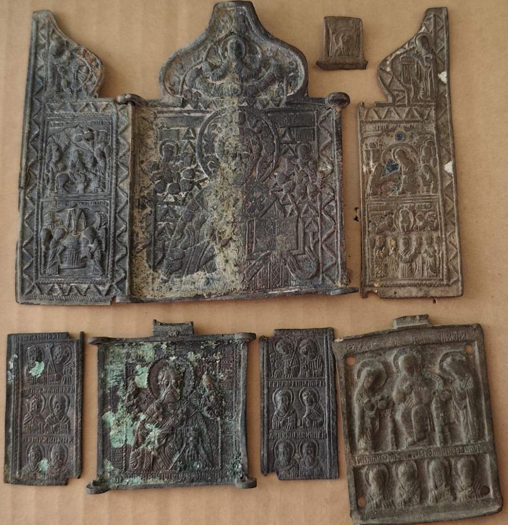 2 складня + средник бонусом. Большая правая створка и малое оглавие неродные. Остальное родное. Под реставрацию.