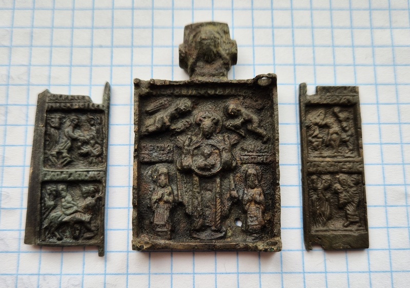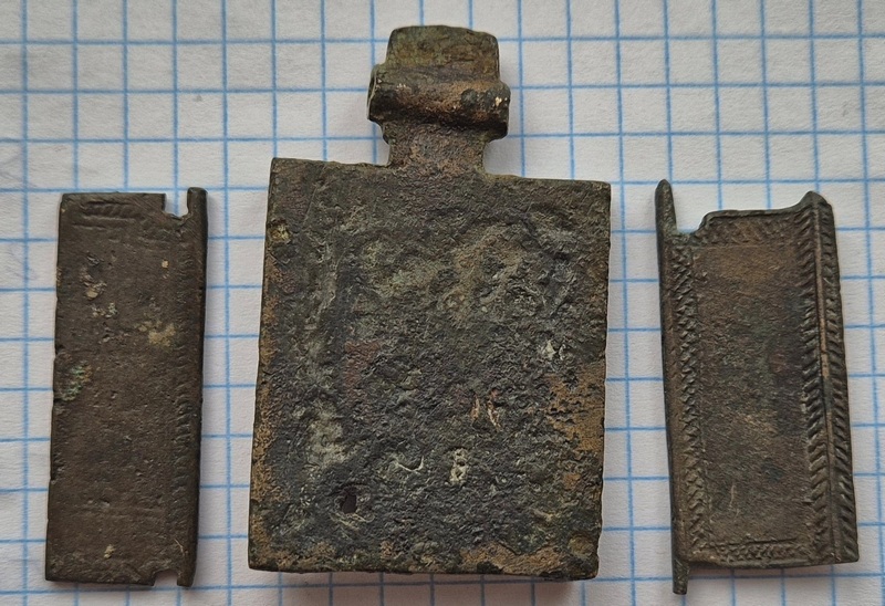Прошу оценить для последующей продажи. Левая створка родная . Правая подобранна. Нет верхнего левого ушка .небольшой непролив в правом нижнем углу(видно на фото). Что не влияет на редкость данной иконы. Размер средника 55х33 мм. Вложенные эскизы изображений |