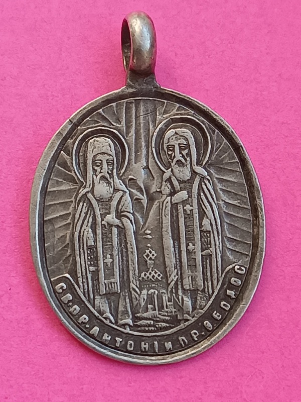 Здравствуйте. Вероятнее всего на образке изображены основатели Киево-Печерского монастыря - преподобные Антоний и Феодосий, а на оборотке великомученица Варвара. По периоду, думаю - конец XIX - нач.ХХ в.