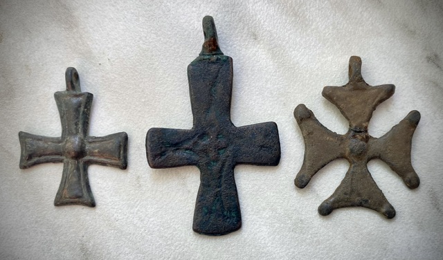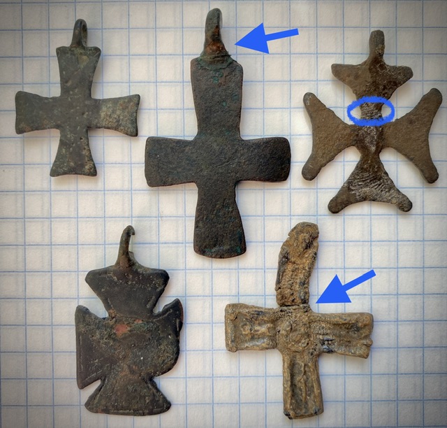 Три крестика Византийской империи, найденых на побережье Чёрного моря и в предгорье Кавказа. Синим цветом на фото указаны места склеек (учитывайте возраст предметов… Плюс бонусом, два крестика, этого же периода бытования (вероятно, ранние аланы 🤔). Старт: 500 шаг - 50 + Блица нет. Антиснайпер 10 мин., многократно. Оплата: карта СБ. Доставка: почта России, по чеку. Вложенные эскизы изображений -------------------- систем+