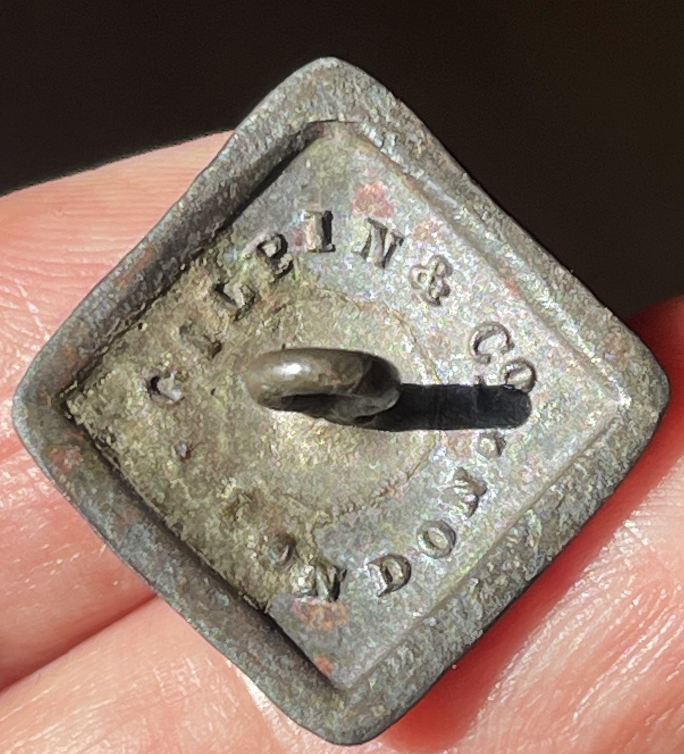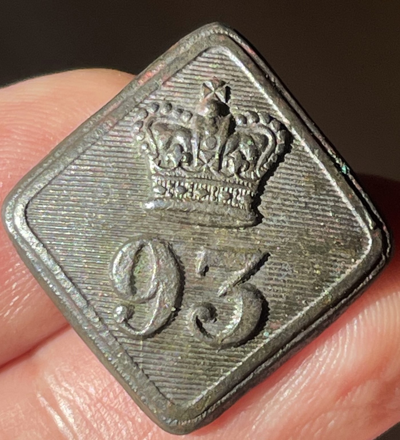 Судя по креплению ушка, она не может быть 1840-1855 гг, она скорей ближе к концу 19 века, у офицерской пуговицы 1840-55 гг, номер и корона и нет кантика вокруг.