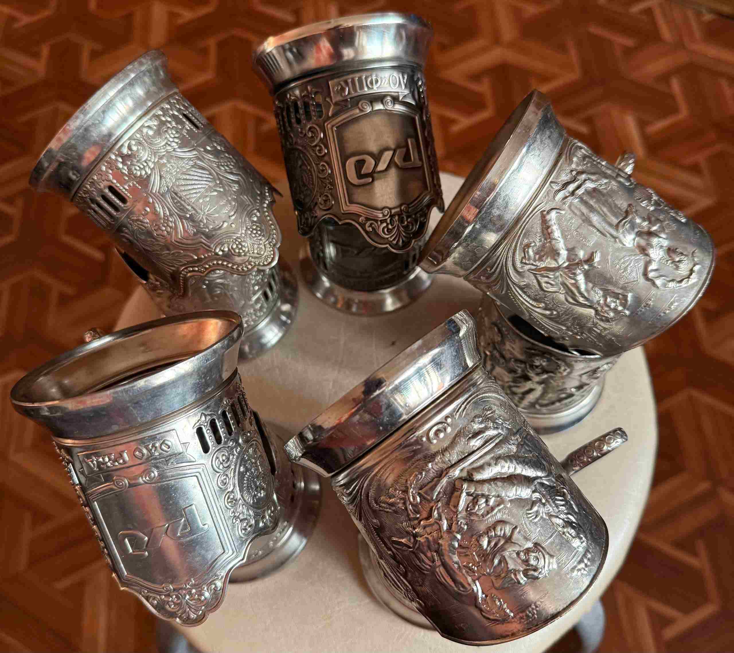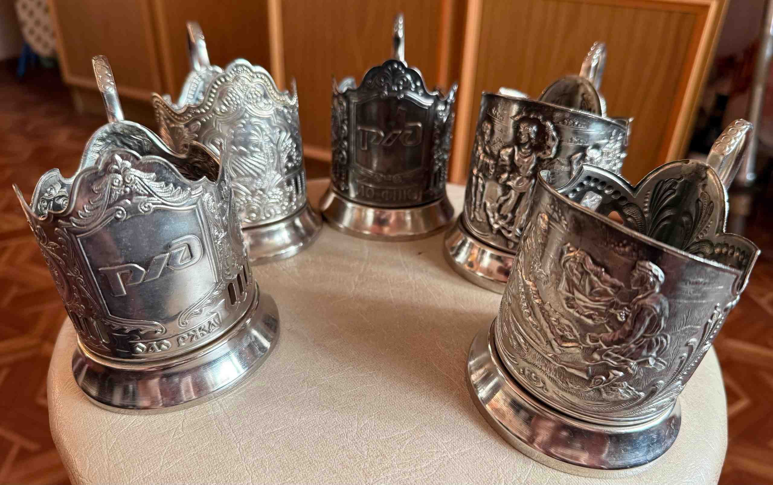 Подстаканники 10 штук 5 видов клеймо Глухарь Л68/Л88 Кольчугино современные: ОАО РЖД, Охотники на привале, Русские пляски, Старый Крым, АО ФПК РЖД каждого по 2 штуки. Б/У в очень хорошем состоянии. Латунь никелированная, тяжёлые.