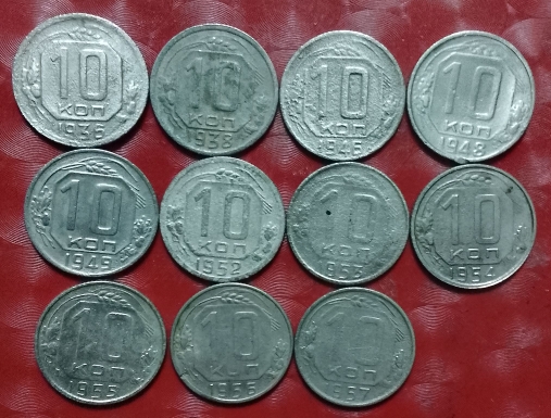 Погодовка СССР: 11 монет по 10 копеек без повторов