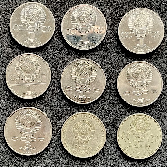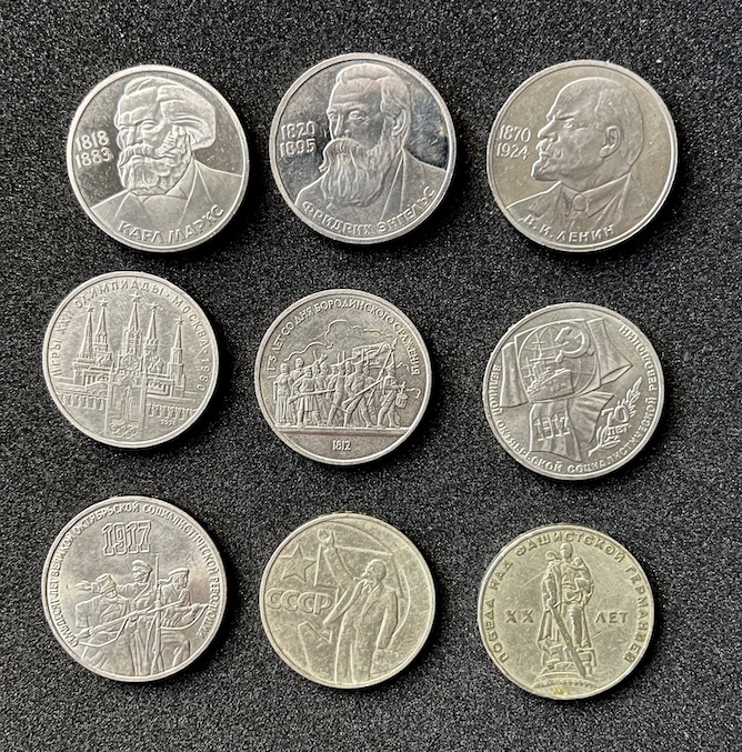 Предлагаю вашему вниманию 9 монет ( 8 шт -1 рубль и одна - 3 рубля). 1. Карл Маркс - 1 руб 1983 г. 2. Фридрих Энгельс - 1 руб 1985 г. 3. В.И. Ленин - 1 руб 1985 г. 4. Олимпиада 80 - 1 руб 1980 г. 5. 175 лет Бородино - 1 руб 1987 г. 6. 70 лет Революции - 1 руб 1987 г. 7. 70 лет Революции - 3 руб 1987 г. 8. 50 лет Советской Власти - 1 руб 1967 г. 9. 20 лет победы в ВОВ - 1 руб 1965 г. Первые семь монет без хождения, в блеске. Старт – 100 рублей Шаг – 20 рублей. Блиц – нет. Антиснайпер 10 мин Доставка по России на покупателе, способы обсудим. Вложенные эскизы изображений |