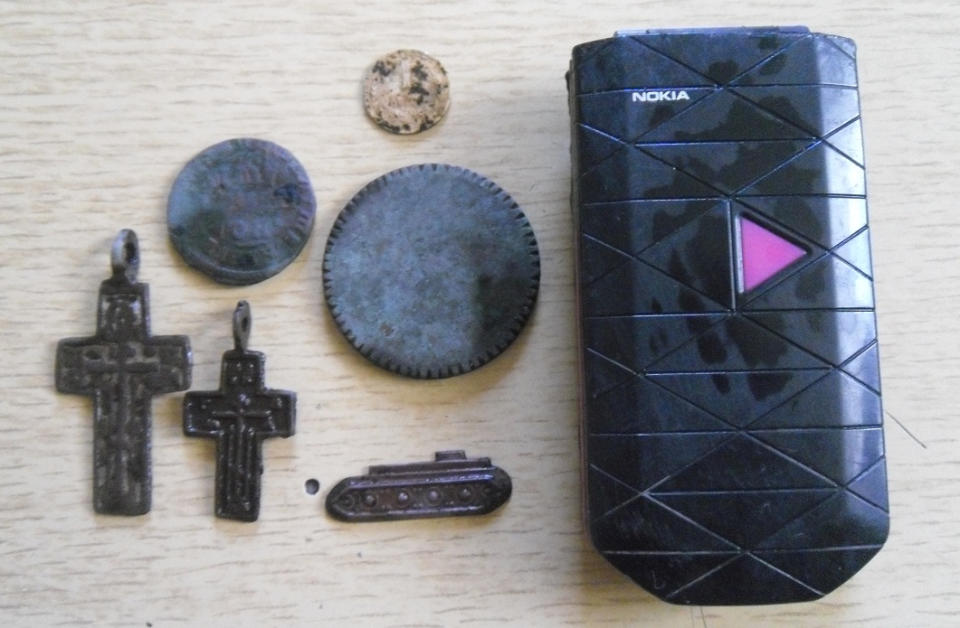 Взял Велосипед и поехал высматривать новые местечки. Один огородик мне покоя не давал, но он зарос, пройти нельзя, не то что бы с МД копать. А тут еду, глядь а огородик то сожгли почти весь Соток 7 прошел и ничего, совсем ничего! Потом заметил пару ямок квадратной формы, ну значит наш брат побывал здесь. Но потом выскочил крестик, праздник же А потом Дедушка подкинул мне замечательный стильный телефон, лежал рядом с тропинкой и чуть пострадал от огня. Наверно а траве густой потеряли. Ну и в конце ещё один крестик побольше. Вот как то так. Всем удачи и Фарта! Вложенные эскизы изображений -------------------- Душу – Богу, Жизнь – Родине, Сердце – Девушке, МЕТАЛЛОИСКАТЕЛЬ – НИКОМУ! ! !..