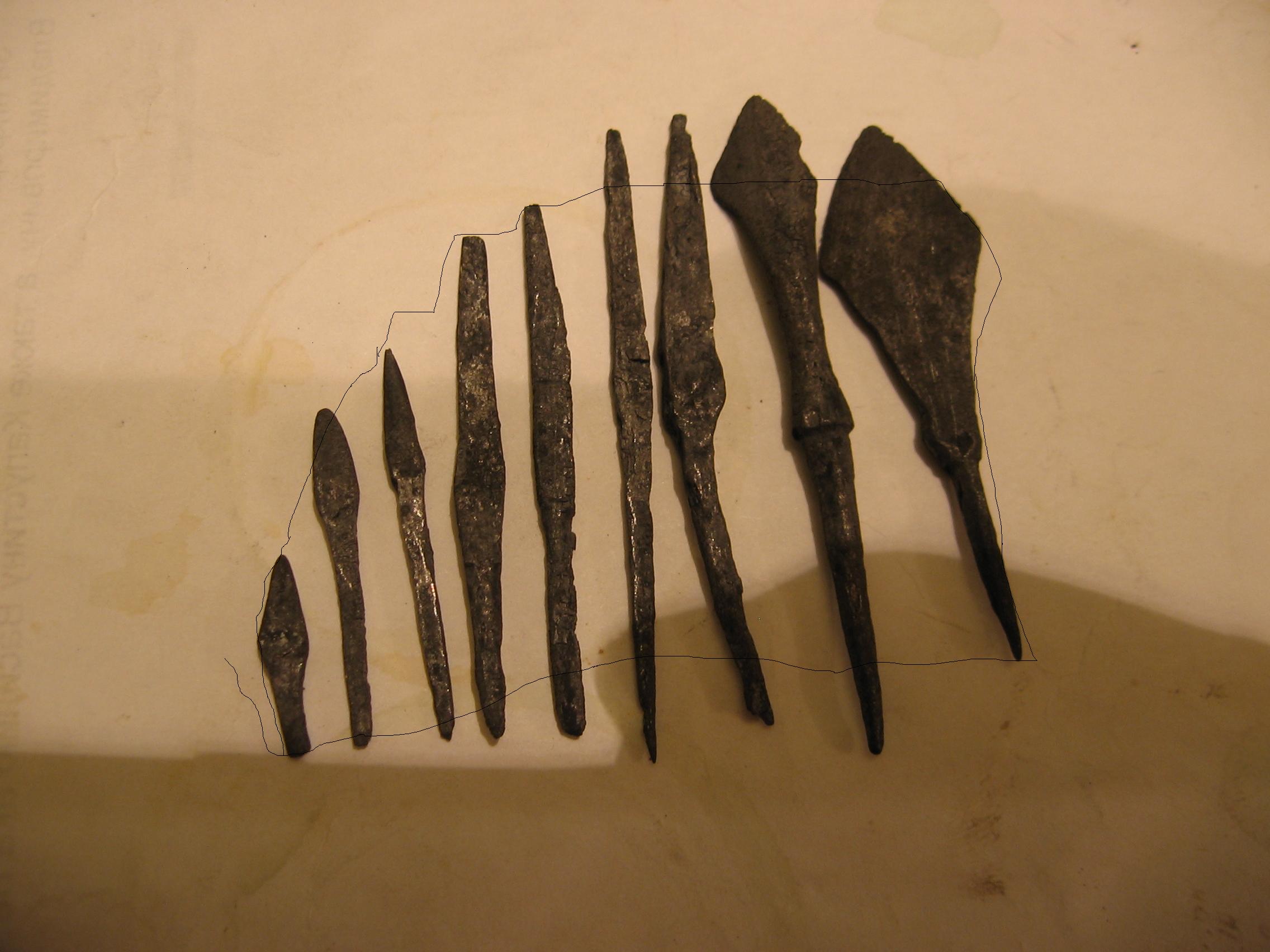 Доброго времени суток друзья!вот пошарил просторы тырнета, почитал про востановление металла в углеродной среде,написанно интересно, дай попробую сам, взял несколько наконечников, два из них с городища ,а остальные по черняховским поселениям ,до прожарки их чёт не сфотал, но после прожарки стали выглядеть куда лучше, видно чётка места ковки