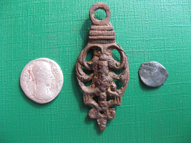 QUOTE(Владимир.А.Е. @ May 31 2015, 08:59) фото конечно не очень но могу предположить что это или накладка или пуговка, ее бы с боку сфотать.... по ценности думаю ровна нулю.... на пуговку похожа, но ушко без дырки! Вот ути усики наверное что то зажимали! Может быть это верхушка перстня какого то? |