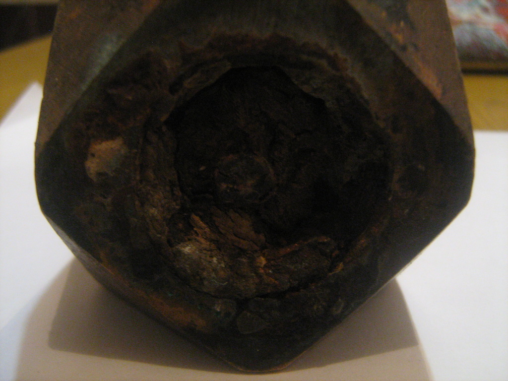 ...внутренняя часть утяжелена(скорее всего свинцом), просматриваются остатки древесины(старой)