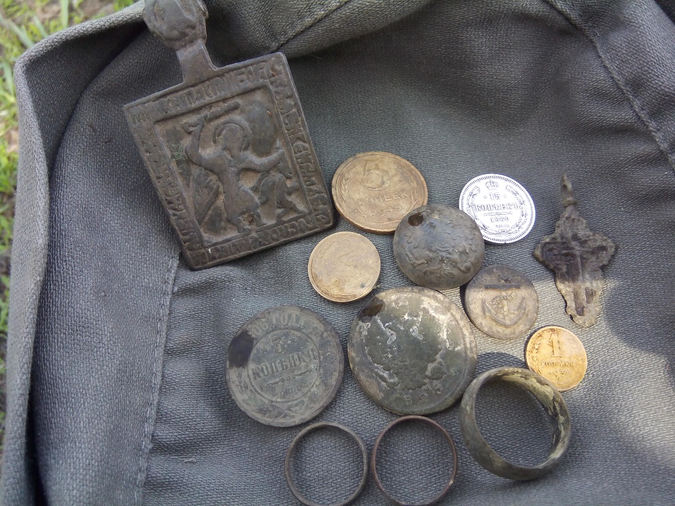 сегодня не выдержал и махнул в поля, пока ехал на место увидел 2 лисицы и удивился давно я их так не встречал, но день чудес на этом не закончился, приехал на место шарюсь с металлоискателем и тут слышу из леса на меня что то движется как танк ломая ветки я замер и тут из леса выходит Лось, стал и смотрит типа хрена ты тут лазишь, честно я от страха чуть кирпичей не навалил в штаны, благо он пару секунд постоял и обратно.....впечатлений масса от копа правда толком и покопать не вышло , дождик прогнал, часа 2 от силы побродил, вот результат...