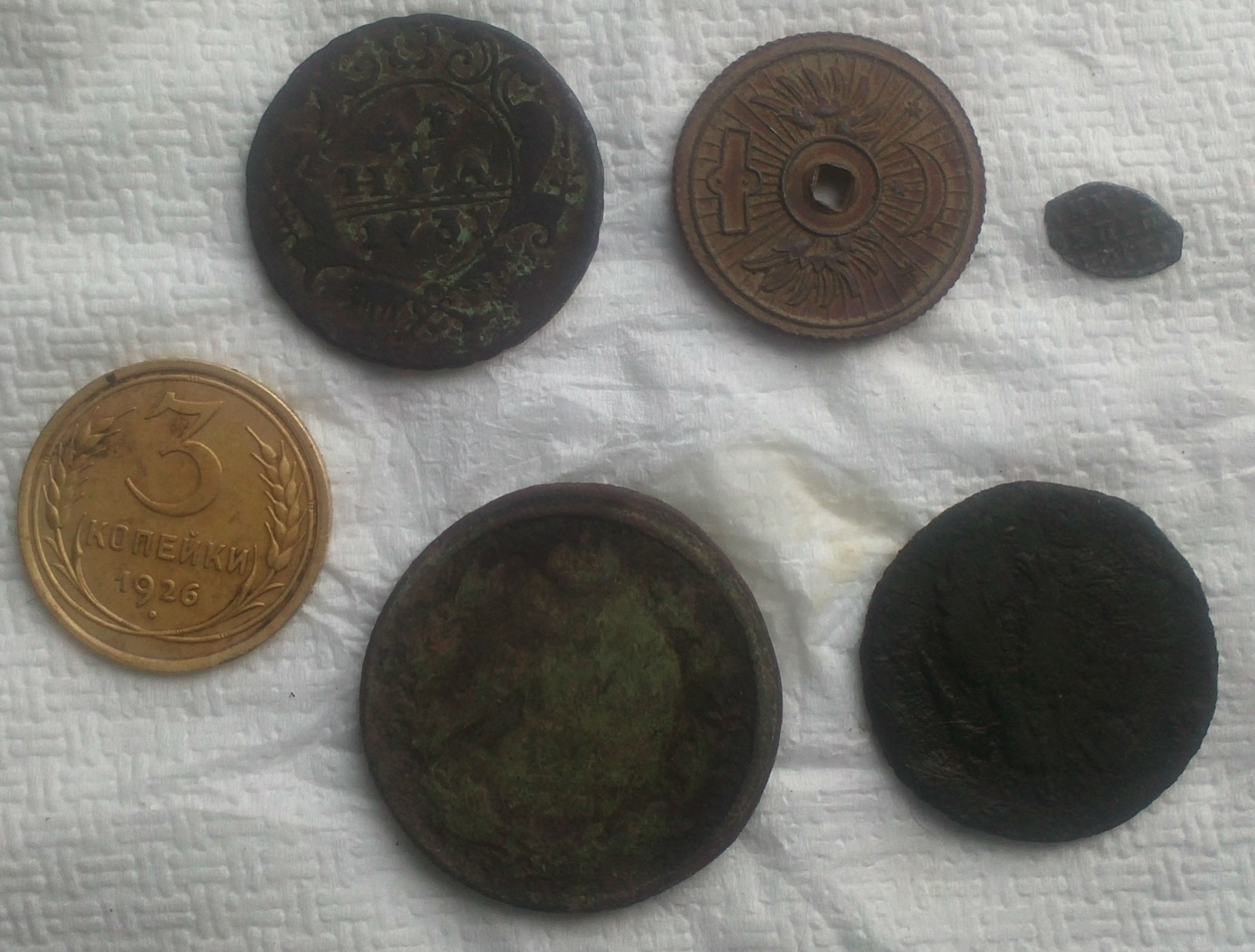 Вчера покопал с друзьями с форума. Своим они похвалятся если захотят, мое на фото.... Не особо конечно, но показываю не все, да и медалька порадовала! Находки после ночи в мыле. Петровскую копейку жалко- окалина металлическая.....