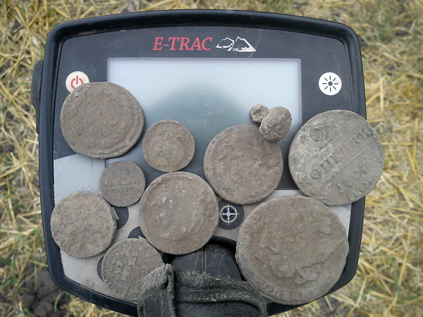 Сегодняшний улов с изрядно битого мной и не только мной места. До этого старался там ходить на максимальной чуйке, думал все глубинные сигналы собрать, и вроде сигналы кончились, а сегодня чуйку снизил до 20, маску монетную, быстрый отклик и полезли монеты рядом с железками (место довольно мусорное).