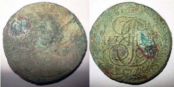 Монета в хорошем сохране, но на орле есть небольшой, толстый (скрывающий рельеф) зелёный налёт. Как я понял нужна лимонная кислота, но как лучше её наносить чтобы не стереть патину? Ватным тампоном или погружать монету (полностью или только повреждённый край)? ![]() |