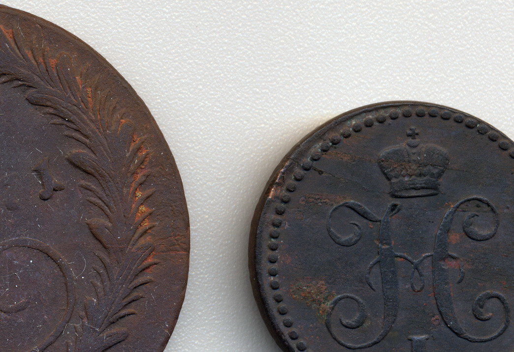 QUOTE(Zergus @ Nov 19 2010, 08:58) пока ничего не делалось, только промыл водой Спрашивал... что делалось... потому что... Эти окиси сильно похожи на окиси железа... т.е. свободные частицы железа при определенных условиях могут перекачивать на монету... образовав соединение меди и железа... сам получал такой эффект случайно нагрев монеты в воде в металлической посуде и произошла хим реакция... Насчет этих соединений (медь+железо)... оно очень хрупкое... по левой монете... ее легко почистить... щеточкой или зубачисткой....можно попробовать чем нить острым... типа скальпеля... но очень аккуратно при хорошем разрешении микроскопа или лупы... проблем с первой монетой я не вижу... и думаю все будет очень неплохо... Насчет второй монеты с ней гораздо все сложнее... по монете видны очаги бронзовой болезни... при желании можно обработать БТА и проверить... ну или просто соблюдать определенные условия хранения....держите ее подальше от других монет....Проблема по второй монете заключается в том если тронуть образовавшуюся корку коррозионного вздутия .... вы на 90% получите каверну... соединение опять же хрупкое... корка высыпится (получится примерно такой же эффект как если сковырнуть ногтем на машине здутую краску на глилом кузове)... поэтому нужно закрепить ее....а потом ручками расчистить под микроскопом очень и очень аккуратно...хотя быть получится минимизировать недостатки... Если вторую монету тронуть химией... на 100% ухудшите монету... поэтому только механика... с использованием шабера и микроскопа.... А если нет не желания не возможностей... заняться механической чисткой... лучше вообще вторую монету не трогать.... Сообщение отредактировано Терек: Nov 19 2010, 11:27 -------------------- "Бойтесь своих желаний — они имеют свойство сбываться" (с)