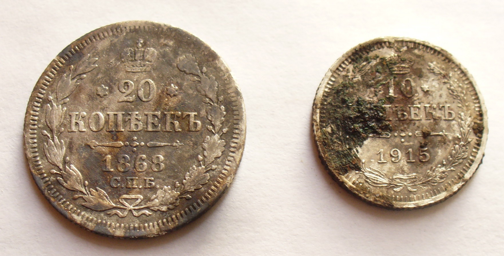 Подскажите пожалуста по этим двум монеткам. Монетки чищены в слабой лимонной кислоте ватными палочками. Про 20 копеек интересно- что за черные и местами бурые пятна и как их можно убрать? Про 10 копеек-там где цифра 10 проступает медный оттенок- это вылазит медь? Буду благодарен за ответы- первые билоны, еще опыта нету. |