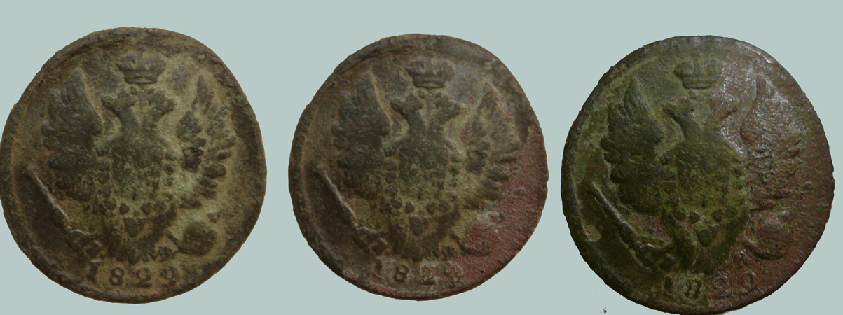Продолжил эксперименты по чистке копейки 1829 года. Теперь уже под микроскопом. Первое на что обратил внимание, что там где слой окислов тонкий (поле монеты) полароид закрепил хорошо. Там где поле переходит в рельеф все гораздо хуже. Сначала идет закрепленный слой, потом рыхлая зеленка, потом рыхлая ржа. При этом слой полароида только мешает убирать грязь. Из-за склеивания начинают отваливаться большие куски до рыхлой ржавчины. Чуть нажал сильнее и все отвалилось. На полушке, которая не была закреплена таких случаев было меньше. Соотвественно убрать шабером грязь не повредив следующюю за ней поверхность очень сложно. Прихожу к выводу, что такие монеты действительно чистить либо очень аккуратно (про мою полушку это не скажешь) убирая только грязь. Для такой чистки нужен опыт, которого пока у меня нет.