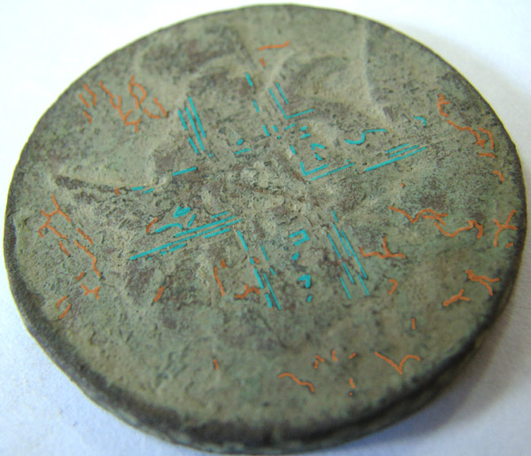 Сложности могут возникнуть в тех местах, где видны прожилки ещё сохранившейся малахитовой патины (отметил оранжевым и бирюзовым цветом). Это остатки оригинальной поверхности. Под ним – может оказаться металл. В итоге останутся островки (линии). Ещё сам прежней крест наверняка станет не так заметен. Хоть там и просвечивается куприт, но, если удалите остатки твёрдого малахита, то картина поменяется. Да, не думаю, что так легко кисточкой получится снять «прожилки». Тут надо что-нибудь потвёрже. Покрыть парафином, чтобы сгладить шершавый куприт. Сообщение отредактировано Mika88: Jul 8 2009, 00:02 Вложенные эскизы изображений -------------------- Границы реставрации заканчиваются там, где начинается гипотеза