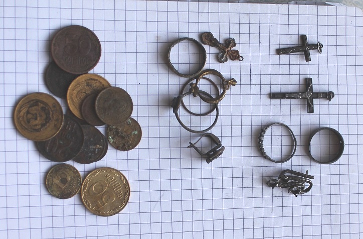 выходил на пляж с Жениной катушкой у себя на водохранилище , днем раньше на этом пляже два копаря один с ат про, второй с мечем(комрад с запорожья приезжал) отходили часа четыре я полез в воду на следующий день на этот-же пляж , золота они не копанули но один штук шеть сережек бижутерии накопал и одну серебряную(с их слов ) второй тоже пару сережек и монет, пляж с мусором железа , копал практически все сигналы между железным мусором, сигналы четко по звуку серебро слышно, вди я в воде не смотрю (золота не попалось) находки все старые совдеповская мелочь бижутерия и серебро , серебро между мусора и монеты видит катушка хорошо, ходил тоже около четырех часов, как то так