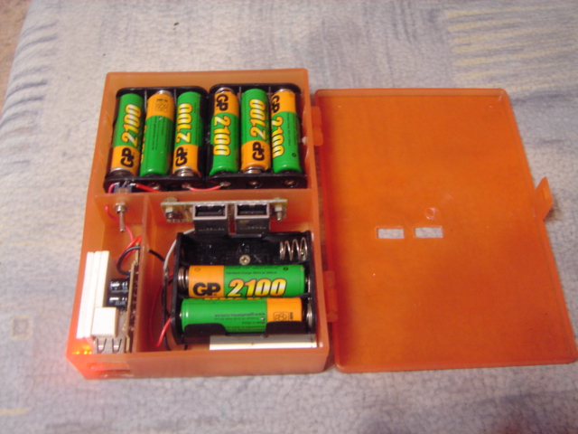 QUOTE(BRAVIY @ Nov 9 2012, 16:32) Я решил этот вопрос.... вот таким способом Взял пластиковую коробку (для рыбацких крючков (50руб)) + кассеты под батарейки(аккумуляторы) ...по 15 рубх3шт. Купил авто зарядку на 5в ток нагрузки 1А.....сразу с 2 USB выходами (думал о напарнике)...за 80руб. Ещё платку с двумя USB выходами (подключил на прямую...от кассет (12В)....бодключаю фонарь...в палатке)...за 10руб Ну и мини тумблерок(10руб) , для переключения напряжения....на 12 или через авто стабилезатор 5 Вольт. Кассеты соединил последовательно в набор (12В), платку авто зарядки,вытащил из корпуса и встроил в коробку зарядника. Всё соеденил в единую схему....и вуаля!.....зарядник готов к действию Свинцовый аккумулятор на 7.4 Ач, как писал выше, будет проще и емкость в 5 раз выше. |