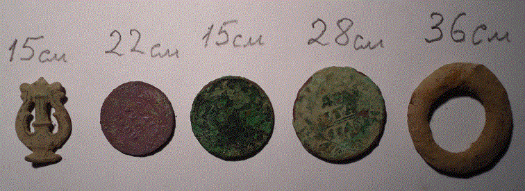 QUOTE(Mr. Freeman @ Jul 25 2010, 15:48) 50см круто Что сказать Господам купившим DEUS... Точите лопаты!!! Только с "тестового копа" вернулся... Земля плотная, глинозём, приходилось рубить её лопатой, почти без влаги... Поле очень бедное на монеты... сухостой 5-7 см.. но... Вот фото находок... "значок", полушка (убитая), копейка 1924 года (убитая), деньга (еле живая), кольцо (вроде целое Прибавьте зазор между катушкой и землёй - (5-10 см). Господи! За, что такие ямы... ________________________ Забыл, настройки... GB - 86-87! <<<Если травы нет>>> Иначе отклик не симметричный, при либрации катушки над целью и глубина страдает (немножко). Чувствительность 93... Частота (при поиске меди) - ТОЛЬКО 4 кГц! Иначе глубина страдает... даже на полушку... Ну и ямы, мама дорогая... Шурфил по слоям, точно до цели... ________________________ Да! И реактивити НА <<<1>>> Иначе - тоже глубина страдает! ________________________ На 4 кГц прибор автоматически повышает ток в катушке до значения "3". На остальных частотах, по умолчанию, стоит значение "2". Возможно по этой причине на частоте 4 кГц прибор лучше видит монеты. Испытаем, уточним... _______________________ Уточнили... QUOTE(Mr. Freeman @ Jul 25 2010, 21:24) мне с Сиболой такое только снилось Кованины? Так и "не удалось" выкопать ни одной джелезяки. Прибор не даёт. Сообщение отредактировано RADIO_MAN: Jul 26 2010, 18:05 Вложенные эскизы изображений -------------------- Не ошибаются только бездельники.